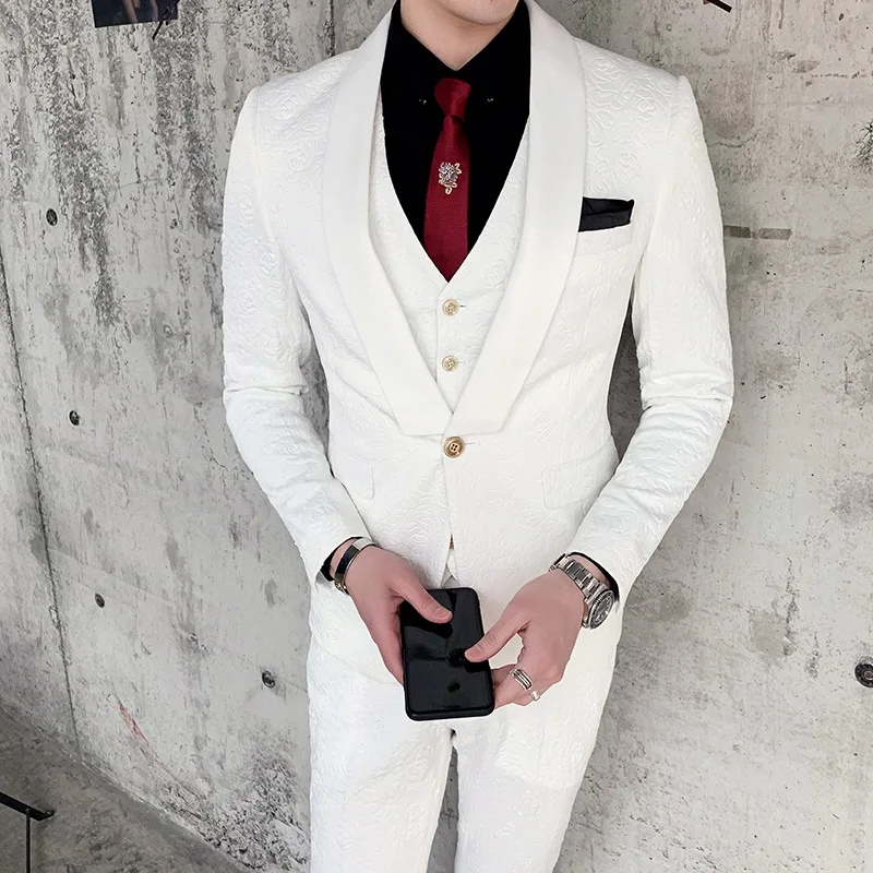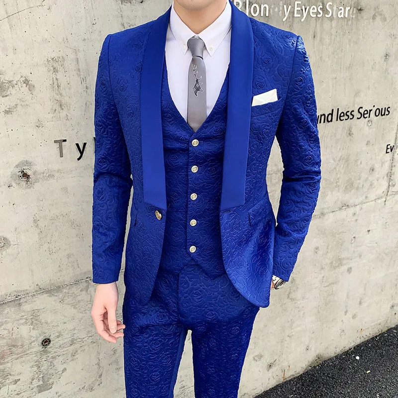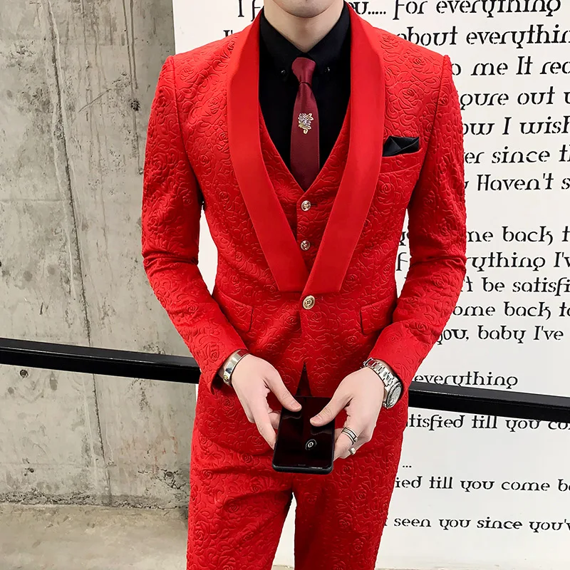.image for New Men's Shawl Collar Groom Dress Fashion Rose Relief Design Slim Suit 3 Piece Set Ewedding Party